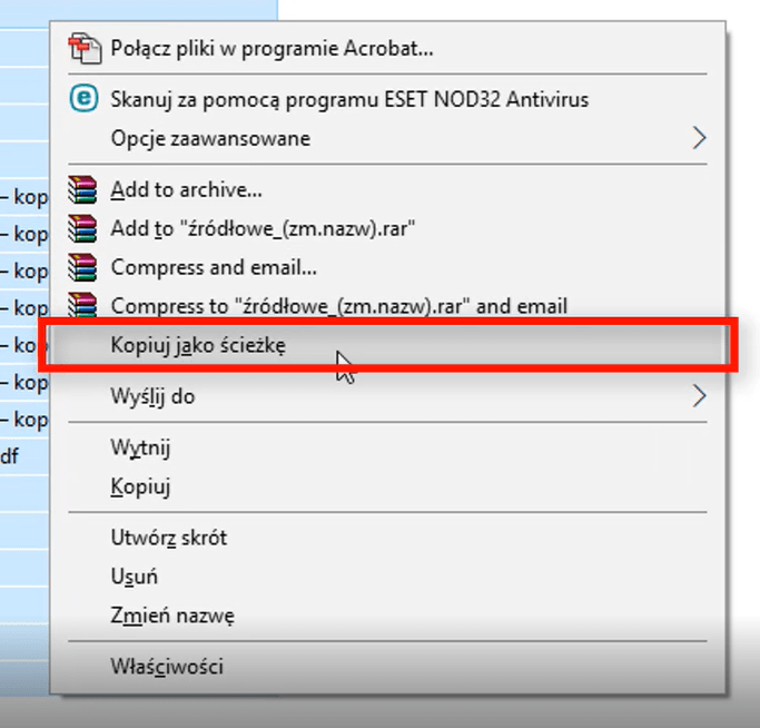 Wystarczy zaznaczyć wszystkie pliki w folderze, przytrzymać klawisz shift i w podręcznym menu pojawi się opcja „Kopiuj jako ścieżkę„.