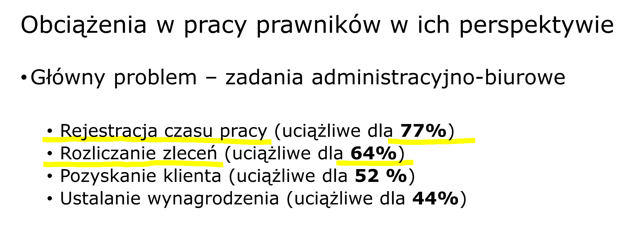 Na koniec dyskusja zeszła – także tradycyjnie – na problemy techniczne i technologiczne związane z rejestracją czasu pracy. Ale czy mogło być inaczej, jeśli zdaniem respondentów głównym problem i uciążliwością dla prawników jest rejestracja czasu pracy i rozliczanie zleceń?