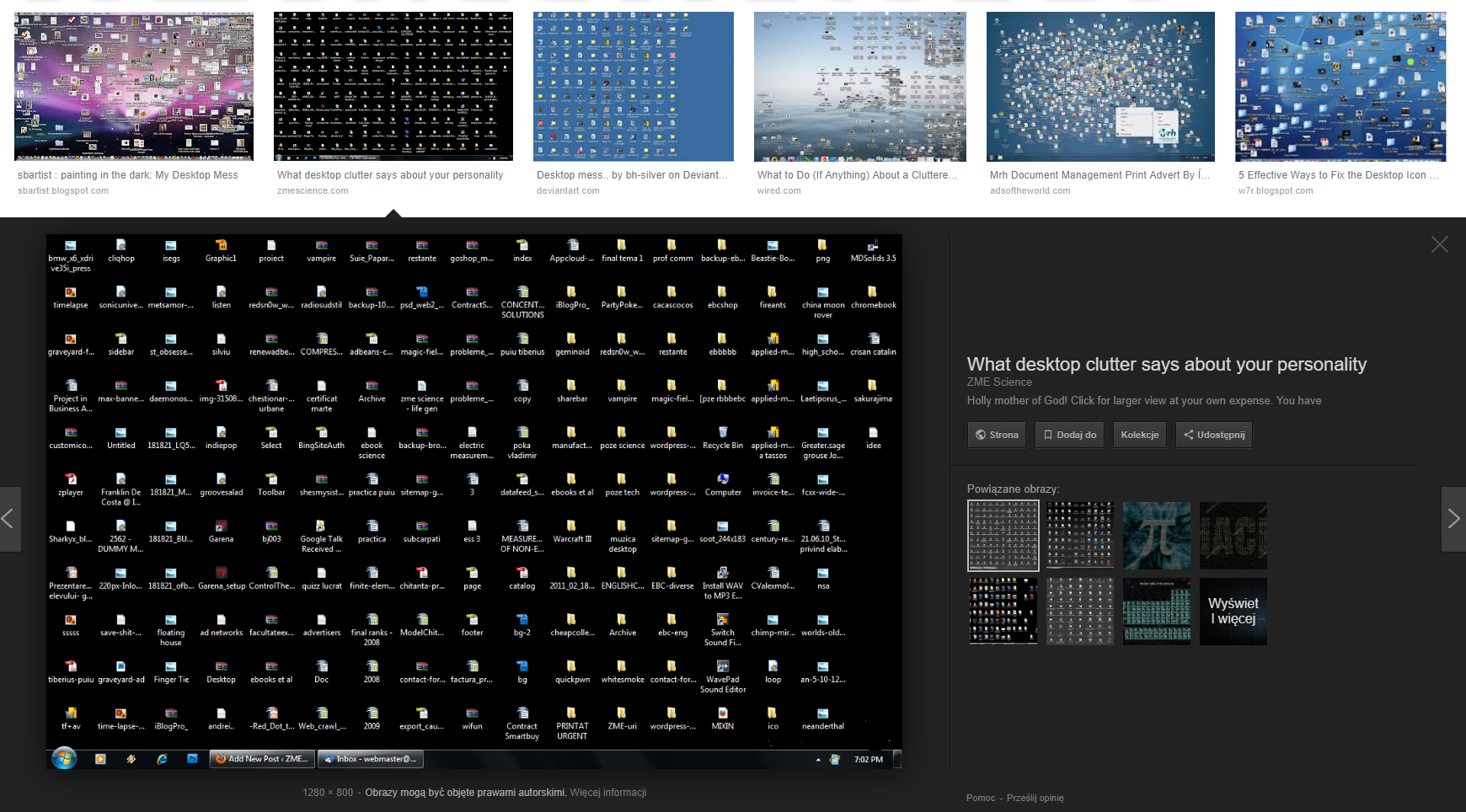 Tutaj od razu przypomina się mój kolega mecenas – znakomity prawnik zresztą – którego serdecznie pozdrawiam, jeśli się rozpozna w tym wpisie ;-). Ów kolega, dawno temu, dość swobodnie podchodził do prządku w plikach. A mówiąc wprost – miał na pulpicie niezły bajzel. Po prostu wszystko na niego wrzucał. Aż przyszedł taki dzień, że miejsce na pulpicie się kończyło… Co robił? Zakładał jeden folder „pulpit z dnia …” i tam wszystko ładował. A później drugi, trzeci, czwarty i kolejne foldery. Aż przychodził taki dzień, że cały pulpit był zastawiony folderami „pulpit z dnia…„. Co robił? Nietrudno się domyśleć. Oczywiście wszytko ładował do kolejnego folderu: „pulpity z dnia … „. Ale w końcu się nawrócił.