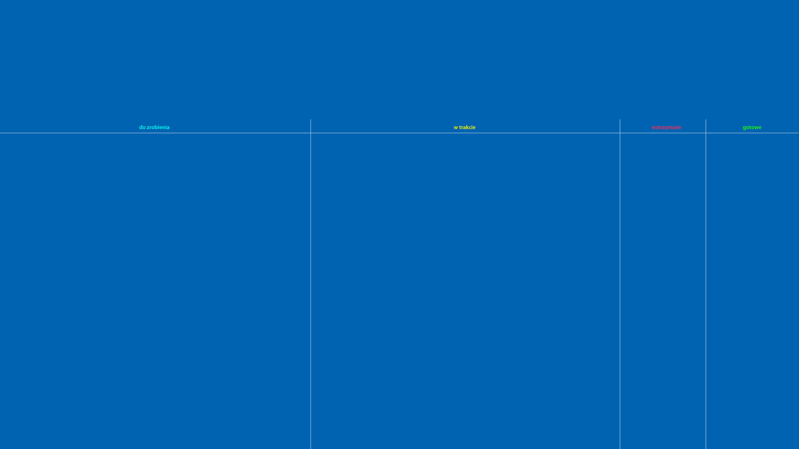 Niezależnie od równoległych eksperymentów z przeróżnymi „task managerami” ustawiłem sobie jako tapetę możliwie najprostszą, samodzielnie zrobioną tablicę kanbanową i dopiero wtedy poczułem, że wreszcie mam użyteczny i nierozpraszający pulpit.