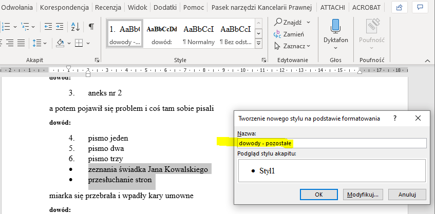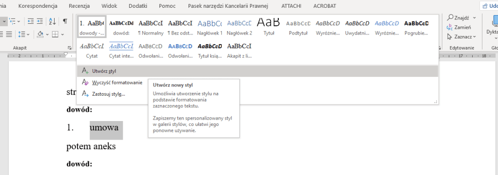 Następnie dla naszych dowodów z pisma należy wybrać jakiś styl (najlepiej utworzyć nowy) i oznaczyć nim każdy dowód, który ma się pojawić na końcu w ramach listy załączników. W tym przykładzie nazwałem nowy styl „dowody – lista”.