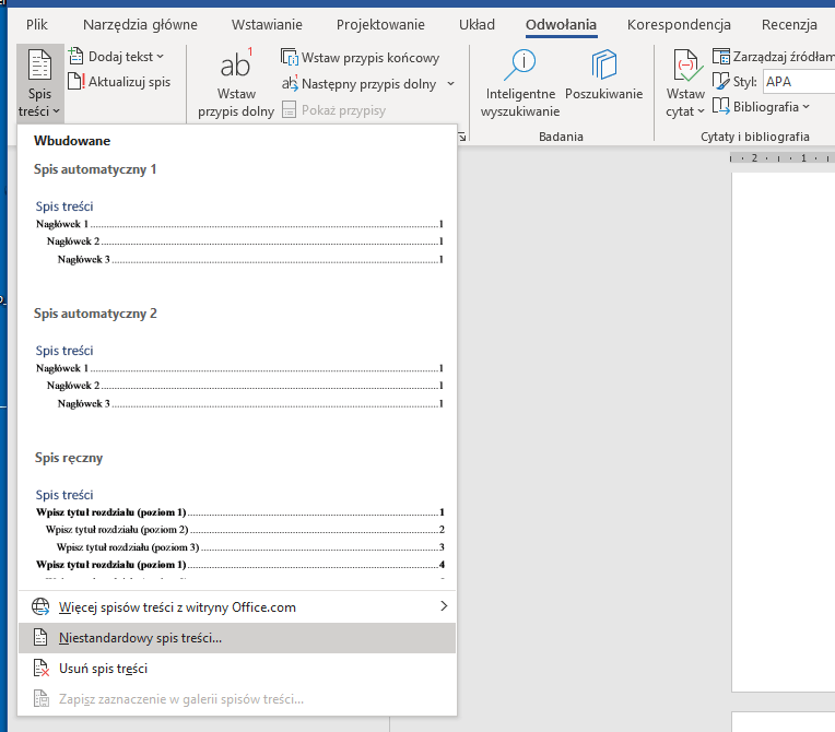 Następnie kursor na koniec pisma i wstawiamy niestandardowy spis treści.