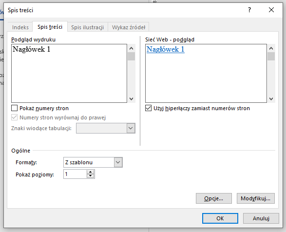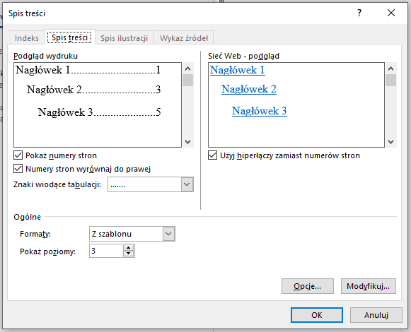 - wstawić spis treści, bazujący na tym konkretnym stylu.