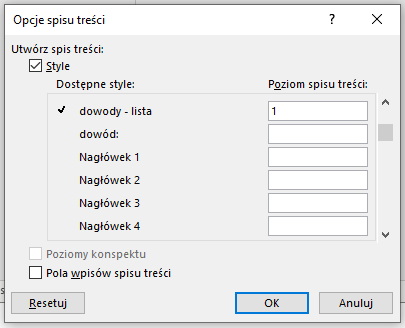Jeszcze tylko w ramach „Opcji” trzeba wpisać cyfrę „1” przy nazwie tego stylu, którym oznaczyliśmy nasze dowody w tekście.