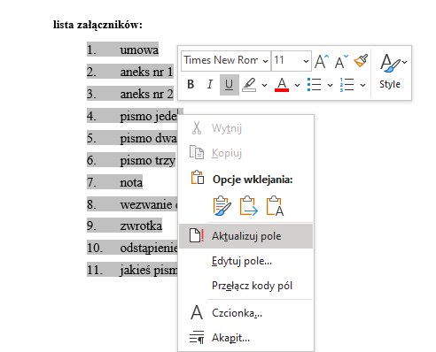 Oczywiście można później dowolnie modyfikować treść pisma i załączniki – żeby zaktualizować sam spis na końcu pisma, wystarczy skorzystać z opcji „Aktualizuj pole” (albo nacisnąć Ctrl+P – wywołanie drukowania aktualizuje wszystkie pola i odesłania w dokumencie).