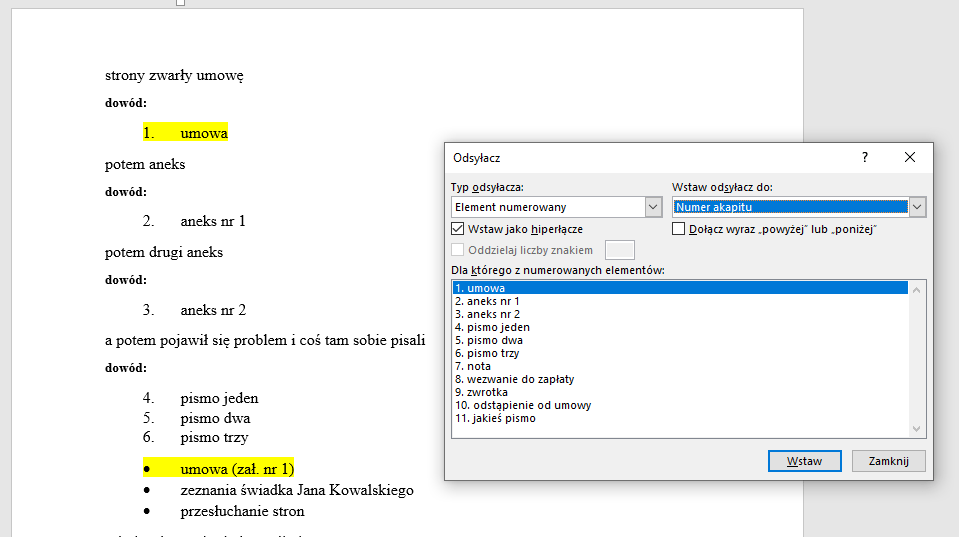 Zawsze szczególnie gorąco polecam korzystanie z odsyłaczy przy każdym elemencie numerowanym (zwłaszcza sprawdza się w umowach przy odesłaniach do innych punktów – w zasadzie odsyłacze mogłyby być tematem na osobny wpis). Tutaj odsyłacz przyda się nam dla identyfikacji danego dowodu-załącznika: nie tylko pozwala – jak nazwa wskazuje – „odesłać” (jak hiperłącze) do wcześniej wymienionego załącznika, ale w razie zmiany numeracji, numer automatycznie się zaktualizuje. Może i jest to trochę upierdliwe, ale to inwestycja, która się opłaca.