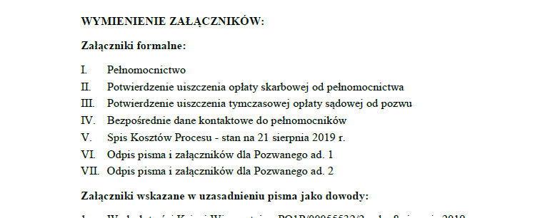 - Są takie załączniki, których w treści pisma nie ma, ale też powinny trafić na listę załączników – najczęściej są to załączniki formalne (opłata, pełnomocnictwo, KRS, itp.), które po prostu trzeba dopisać z ręki, na szczęście najczęściej nie ma ich zbyt wiele. W takim wypadku można po wstawieniu spisu po prostu dopisać je na końcu (co nie zawsze jest optymalne, bo sprawy formalne bada się na początku), albo – co jest moim zdaniem lepsze i czytelniejsze – zrobić po prostu drugą krótką listę ‚załączniki formalne‚ – przed załącznikami-dowodami, wymienionymi w treści pisma.
