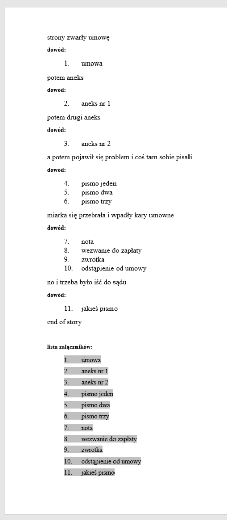 - Inne dowody, które nie mają trafić na listę załączników, a też pojawiają się w towarzystwie dowodów-załączników (np. świadkowie czy biegły) nie mogą być oznaczone tym samym stylem, co numerowane dowody-załączniki; polecam utworzyć podobny styl – np. z kropką i tym stylem oznaczać dowody „nie-załączniki”.