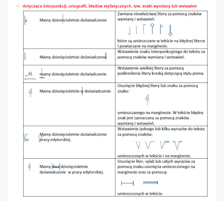 Kluczowa jest metoda i po prostu wyłapanie błędów (wszystko i tak sprowadza się do czasu na spokojne przeczytanie tekstu), natomiast jak ktoś chce, to oczywiście może iść krok dalej i zainteresować się profesjonalnymi znakami korektorskimi – dla nas najbardziej będzie interesująca część dotycząca interpunkcji i błędów stylistycznych: