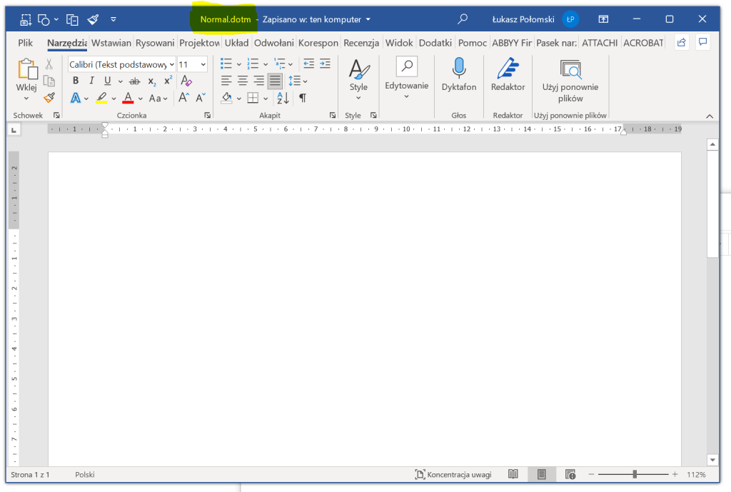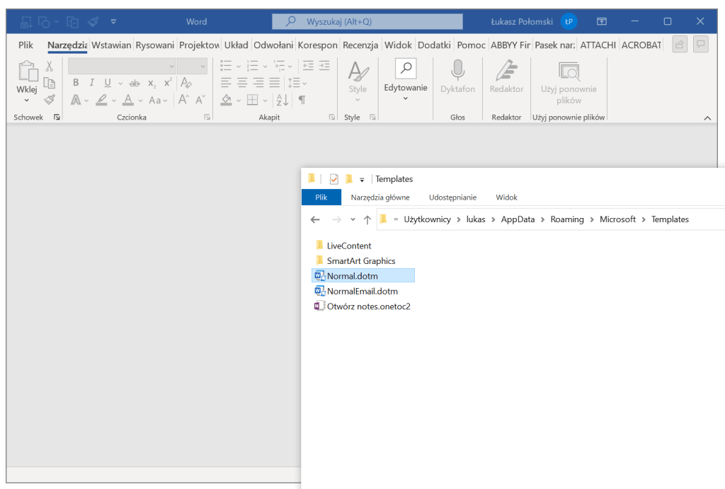 Jeśli wyżej opisane zmiany robiliśmy w nowym, pustym dokumencie, to trzeba go zapisać jako Normal.dotm i następnie umieścić go w miejscu, z którego Word przy uruchamianiu pobiera bazowy szablon nowego dokumentu.
