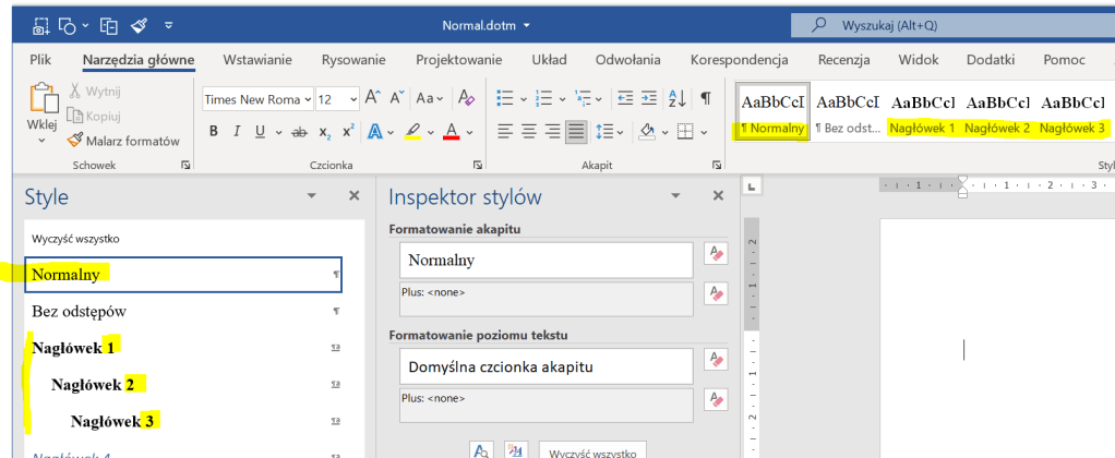 W ramach drogi na skróty, tutaj udostępniam plik Normal.dotm, który posłużył jako przykład i ilustracja do tego artykułu, w środku całe cztery style: jeden normalny dla tekstu i trzy style nagłówka.