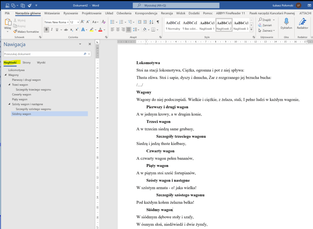 Żeby to czytelnie zobrazować na jakimś przykładowym tekście: dodałem tytuły oraz śródtytuły i oznaczyłem je stylami nagłówków 1, 2 i 3 (po modyfikacji) i od razu wskazuje nam czytelna struktura i możliwość nawigacji (oraz możliwość zwijania/rozwijania poszczególnych części).