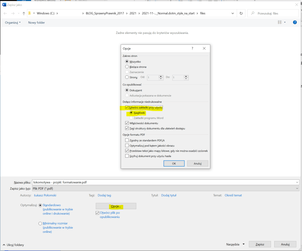 I od razu dodatkowy bajer – jeśli eksportujemy Worda do PDF-a, to tą strukturę i nawigację łatwo można przerzucić do pliku PDF (opcje dostępne w menu „Zapisz jako” / F12).
