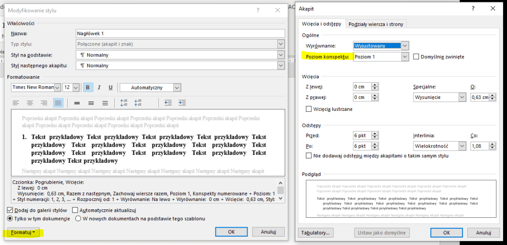 Głównie po to, żeby od razu cieszyć się strukturą dokumentu i nie musieć ustawiać poziomów konspektu – jest to kolejna opcja schowana we oknie modyfikacji stylu („Formatuj” –> Akapit –> Poziom konspektu). Ale to dodatkowa uwaga na marginesie, jakby ktoś chciał inne swoje style mieć z strukturze dokumentu.