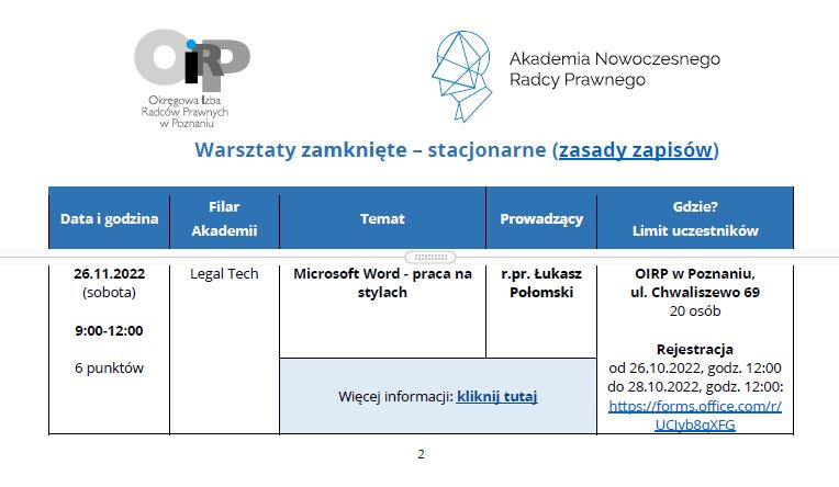 Dziś krótki wpis ogłoszeniowy, jaka jest główna idea i czego można się spodziewać na najbliższym szkoleniu stacjonarnym (nareszcie coś na żywo!) z cyklu Word dla prawników, które odbędzie się w sobotę (weekend!) o godz. 9:00 w siedzibie Okręgowej Izby Radców Prawnych przy ul. Chwaliszewo 69 w Poznaniu.