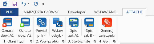 Attachi to plug-in do Worda – mały i sprytny programik z sześcioma niebieskimi przyciskami i jednym czerwonym, po naciśnięciu którego dzieje się prawdziwa magia – pismo z licznymi załącznikami kompletuje się samo! I to w taki sposób, z takimi w pełni konfigurowalnymi oznaczeniami i opisami w nagłówkach i stopkach na każdej stronie, że nie ma miejsca na żadne wątpliwości co jest do czego.